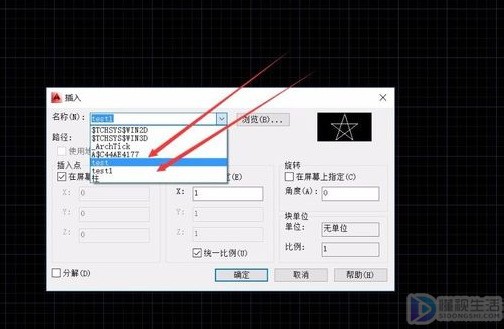 2、點擊“名稱”旁邊的下拉箭頭,選擇我們想要插入的圖塊。