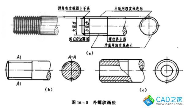 外螺紋的畫法應按國家制圖標準要求去畫與標注(見圖),如需要畫成你照片的實樣,則宜用Solidworks、ProE或UG等三維制圖軟件去畫,以Solidworks為例,先建個圓柱體,并在其一頭外徑作一螺旋線,并按螺旋線切去一三角形以形成螺紋,并按旋轉排列列陣成三個均等三個柱體,再圓角成你要求的形狀后,采用挖空到實際零件,至于右邊的半剖,只要按點下工具鈕上的半剖顯示即可。