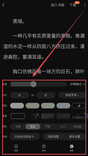 3、閱讀過(guò)程中,可以自由調(diào)整字體、背景顏色等設(shè)置,提供最佳視覺(jué)效果,降低眼睛疲勞,更加享受閱讀的樂(lè)趣。